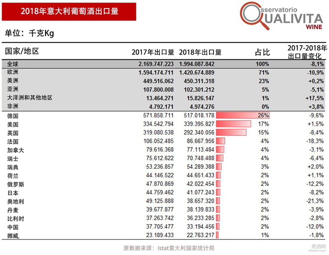 與2017年相比,意大利葡萄酒對(duì)其主要海外市場(chǎng)的出口額均實(shí)現(xiàn)了增長,按上升幅度來看依次是:意大利葡萄酒對(duì)法國出口額同比2017年增加10.1%,對(duì)瑞典出口額增加7.5%,對(duì)瑞士出口額增加4.8%,對(duì)美國和德國出口額均增加4%,對(duì)英國出口額增加1.9%。