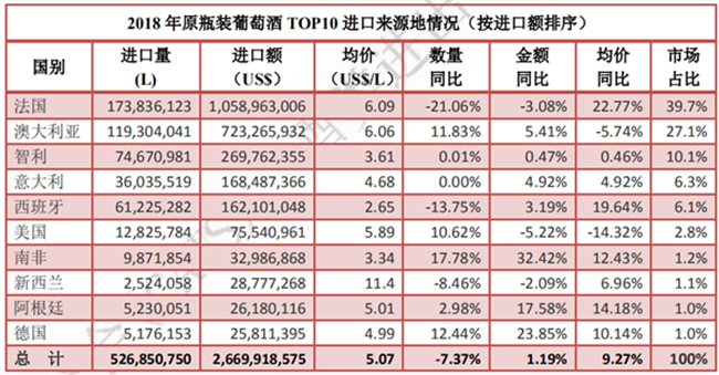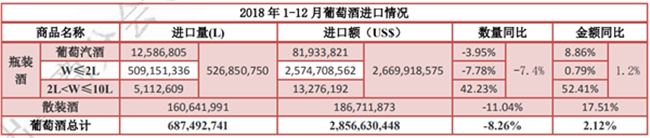 2018 年,葡萄酒進口量雖出現了自 2014 年來的首次下行數據,但跌幅較小,且進口額依然實現了微幅增長,達到 28.6 億美元,約占酒類進口總額的 49.5%,位列進口酒類第一位。其中: