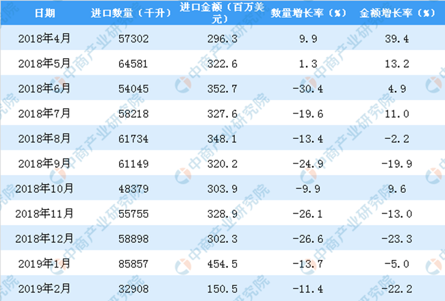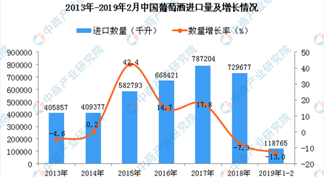 據(jù)中商產(chǎn)業(yè)研究院數(shù)據(jù)庫顯示,2013年-2017年中國葡萄酒進口量增長,共增長381347千升,增長93.96%;2018年中國葡萄酒進口量回落,2019年1-2月中國葡萄酒進口量為118765千升,同比下降13%。