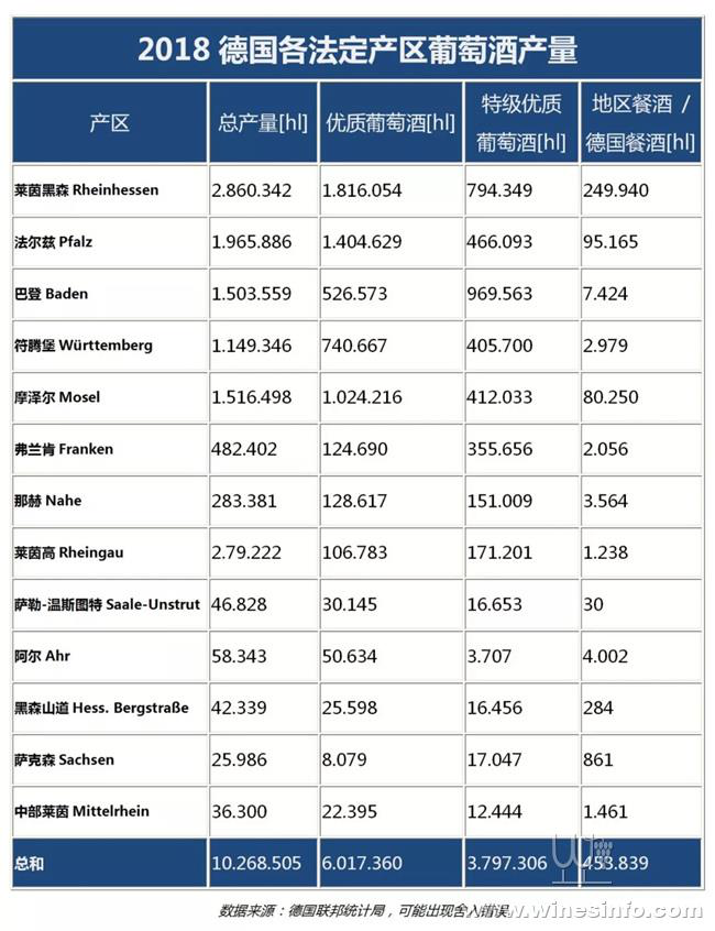 萊茵黑森的葡萄酒產(chǎn)量為2.86億升,是所有法定產(chǎn)區(qū)里最高的,法爾茲次之,為2.48億升。而巴登和符騰堡也分別收獲了1.5和1.15億升,突破了億升大關(guān)。摩澤爾收獲了近9千萬升葡萄酒,弗蘭肯為4.82千萬升,那赫為3.87千萬升,萊茵高為2.79千萬升。地區(qū)餐酒和德國餐酒的產(chǎn)量是4.54千萬升。