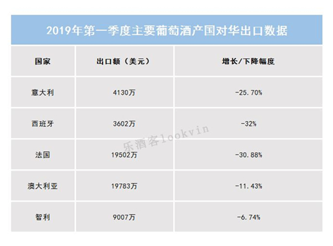 根據(jù)報(bào)告,2019年第一季度中國進(jìn)口葡萄酒進(jìn)口量為1.56億升,較上年同期下降22.3%;進(jìn)口額為7.82億美元,較上年同期(9.8億美元)下降20.19%。