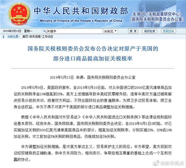 自2019年6月1日0時(shí)起,對(duì)已實(shí)施加征關(guān)稅的600億美元清單美國(guó)商品中的部分,提高加征關(guān)稅稅率,分別實(shí)施25%、20%或10%加征關(guān)稅。