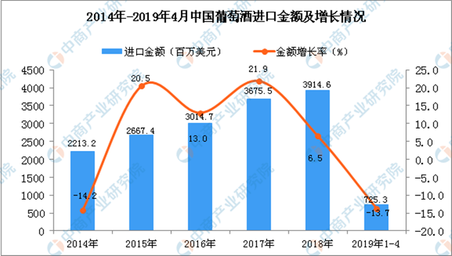 • 2019年1-4月中國(guó)葡萄酒進(jìn)口量同比下降19.6%