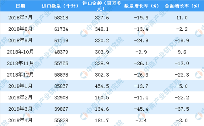 2018年-2019年4月中國(guó)葡萄酒進(jìn)口數(shù)量及金額增長(zhǎng)率情況