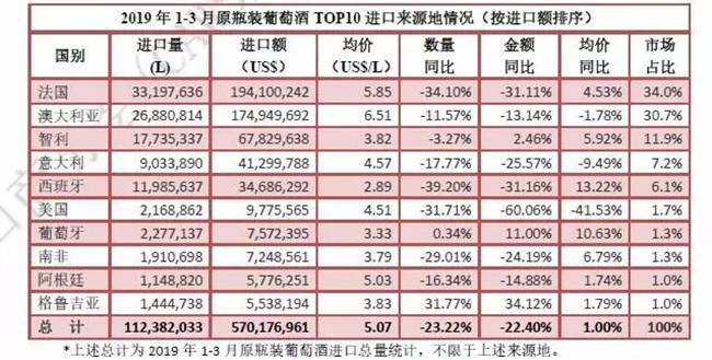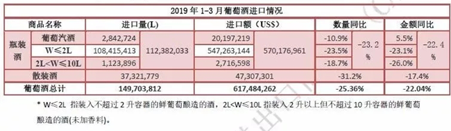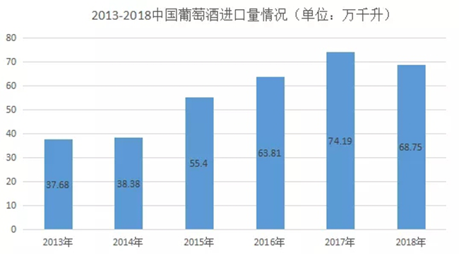 數(shù)據(jù)是反映市場的晴雨表。2013~2018年上半年我國葡萄酒的進(jìn)口量逐年遞增,2018年上半年,我國葡萄酒進(jìn)口量為38.54萬千升,同比增長25.8%。但從下半年開始,局勢發(fā)生逆轉(zhuǎn),最終,2018年度葡萄酒以68.75億升的進(jìn)口量收尾,同比下降8.26%,從上面的數(shù)據(jù)分析可知,2019年一季度下滑態(tài)勢仍未扭轉(zhuǎn)。