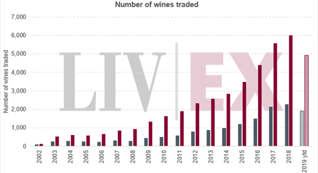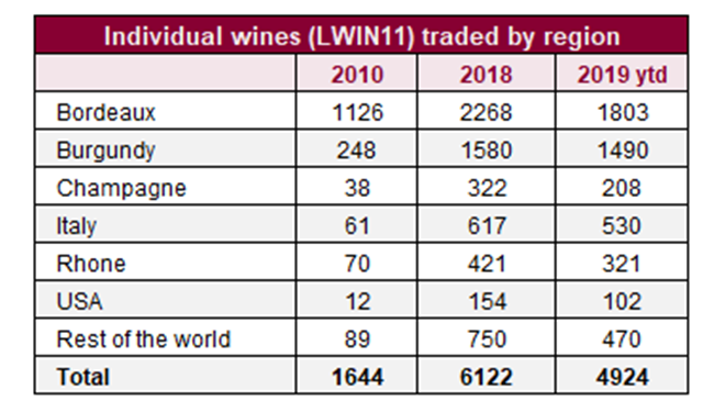 本年至今,已有4924款不同的葡萄酒(包括不同年份)出現(xiàn)交易。它們來自多個不同酒區(qū),包括英國、中國和黎巴嫩;盡管這些國家的交易數(shù)量不多。