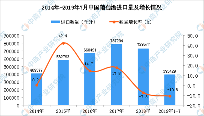 據(jù)中商產(chǎn)業(yè)研究院數(shù)據(jù)庫顯示,2019年1-2季度中國葡萄酒進口量有所增長,2019年1-7月中國葡萄酒進口量為395429千升,同比下降10.8%。