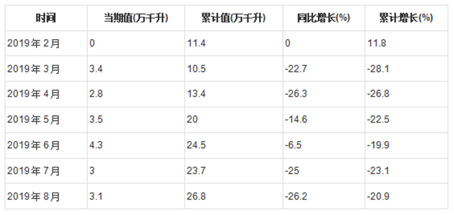 根據(jù)中國報告大廳對2019年1-8月全國葡萄酒產(chǎn)量進(jìn)行監(jiān)測統(tǒng)計顯示:2019年8月全國葡萄酒產(chǎn)量3.1萬千升,同比下降26.2%,2019年1-8月全國葡萄酒產(chǎn)量為26.8萬千升,累計下降20.9%。