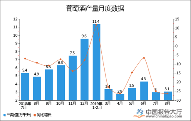 • 2019年1-8月全國葡萄酒產(chǎn)量統(tǒng)計分析