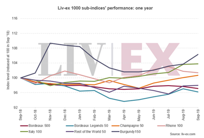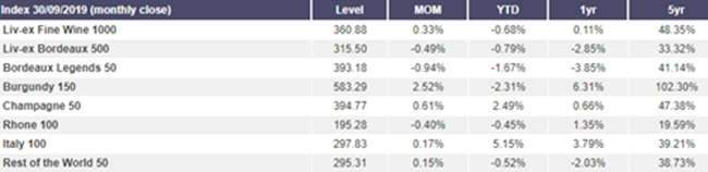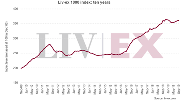 2019年至今,在,Liv-ex 1000(最廣泛衡量優(yōu)質(zhì)葡萄酒市場表現(xiàn)的指數(shù))下跌了0.7%。 該指數(shù)在9月份上升0.3%,收于360.88點(diǎn)。