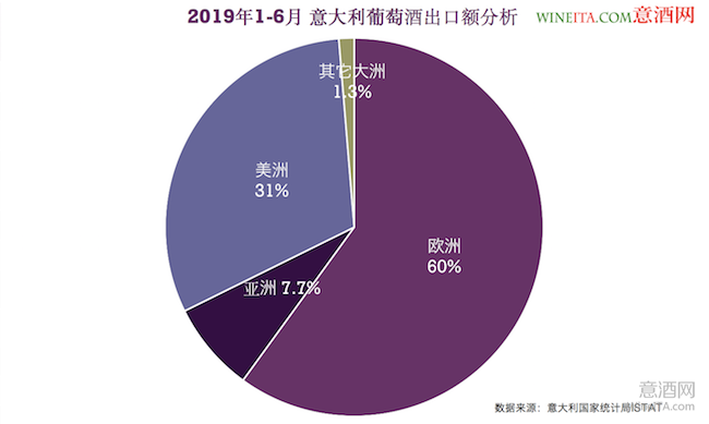 根據(jù)公布的數(shù)據(jù),2019年上半年,意大利葡萄酒出口額達(dá)到30億歐元,較2018年同期增長(zhǎng)了3.1%。其中歐洲所占市場(chǎng)份額為60%(比例較2018年同期增長(zhǎng)3.3%),美洲所占市場(chǎng)份額為31%(比例較2018年同期增加1.44%),亞洲所占市場(chǎng)份額為7.7%(比例較2018年同期增加8%)。此外,與2018年同期相比,2019年上半年意大利葡萄酒的總出口量增長(zhǎng)了8.8%,對(duì)歐洲的出口量增長(zhǎng)了11.2%,對(duì)亞洲的出口量增長(zhǎng)了19.5%,對(duì)美洲的出口量減少了0.8%。