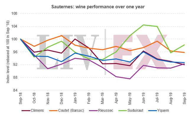 在過(guò)去的一年,蘇玳50中的成份葡萄酒無(wú)一漲價(jià)。如下圖所示,克里蒙Climens跌幅最大(-8.0%),而旭金堡Suduiraut跌幅最小(-1.8%);而最近發(fā)布的伊甘Yquem 2017年也跌價(jià)7.3%。