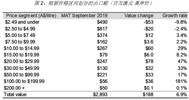 截至2019 年9 月底的12個(gè)月中,澳大利亞葡萄酒對中國市場 (包括香港和澳門)的出口額持續(xù)增長18%,創(chuàng)下12.5 億澳元新高,平均出口額上漲了40%至8.42 澳元/升(離岸價(jià))。