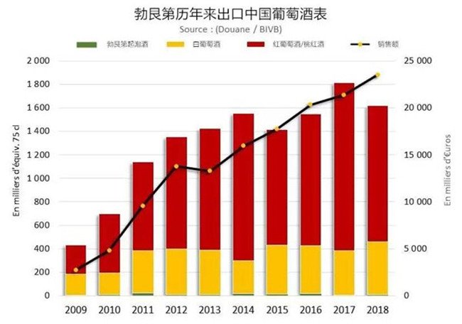 2018年勃艮第出口了1600萬瓶葡萄酒到中國大陸,這個數(shù)量比2017年同期降低了10.6%,但出口價值達(dá)到了2350萬歐元,比2017年同期上漲了9.9%。