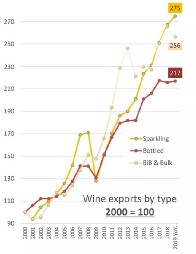 但是,從下圖可以看出,從2009年到2013年,散裝葡萄酒的出口增長速度一度比瓶裝酒快很多。這個速度在2014-2016年之間有所減緩,2019年也有放緩趨勢。