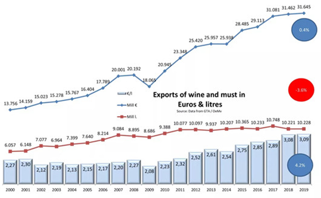 而葡萄酒的出口額最近五年呈現不斷增長的趨勢,由2014年的2.54€/L上漲到2019年的3.09€/L。但是2019年的上升趨勢與2018年同期相比較僅上升0.3%,有減緩趨勢。