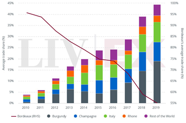 2010年至2019年(至今)在Liv-ex上的酒區(qū)市場(chǎng)份額