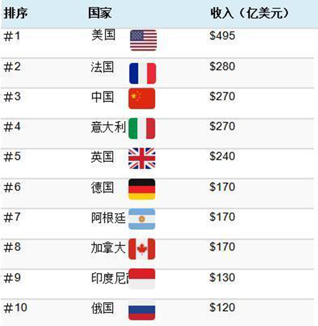 • 世界各國葡萄酒行業(yè)的收入,中國270億美元排第三