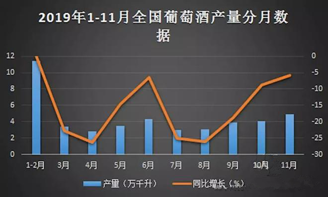 一方面是昂揚(yáng)向上的精神勁頭,另一方面全國葡萄酒產(chǎn)量數(shù)據(jù)卻為其潑了一盆冷水。根據(jù)中國報(bào)告大廳對(duì)2019年1-11月全國葡萄酒產(chǎn)量進(jìn)行監(jiān)測統(tǒng)計(jì)顯示:2019年11月全國葡萄酒產(chǎn)量4.9萬千升,同比下降5.8%,2019年1-11月全國葡萄酒產(chǎn)量為37.2萬千升,累計(jì)下降12.1%。
