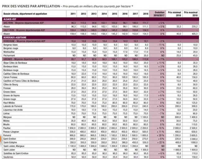 2) 漲幅高達+20%的波美候產(chǎn)區(qū)(Pomerol),由2017年的150萬歐元/公頃上漲到2018年的180萬歐元/公頃。
