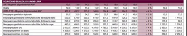 博艮第產(chǎn)區(qū)金丘所有AOP葡萄園都呈上漲趨勢,漲幅也都很均勻,在2%到5%之間。其中漲幅最大的兩個AOP產(chǎn)區(qū)分別是“博艮第大區(qū)級別(Bourgogne Appellation Régionale)”,由2017年的4.1萬歐元/公頃上漲到2018年的4.3萬歐元/公頃,漲幅高達5%。另外一個漲幅高達5%的產(chǎn)區(qū)是“博艮第一級紅葡萄園”(Bourgogne 1er Cru rouge),由2017年的65萬歐元/公頃上漲到2018年的68萬歐元/公頃。