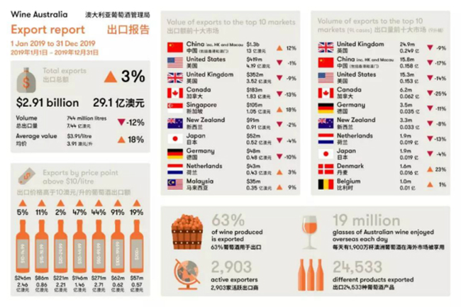 澳大利亞葡萄酒協(xié)會(Wine Australia)今天上午發(fā)布的數(shù)據(jù)顯示,在截至2019年12月的12個月里,澳大利亞葡萄酒出口總額增長了3%,達(dá)到29.1億美元。