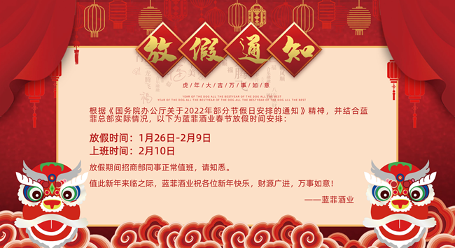 • 新的一年開(kāi)啟新的希望,也將承載著新的夢(mèng)想。感恩2021年,擁抱2022!在新的一年里,我們依舊攜手同心、砥礪同行!再次感謝大家一直以來(lái)對(duì)藍(lán)菲的支持與厚愛(ài),藍(lán)菲酒業(yè)中國(guó)營(yíng)運(yùn)總部恭祝大家虎年吉祥、如虎添翼、虎虎生威、萬(wàn)事如意、闔家歡樂(lè)!...